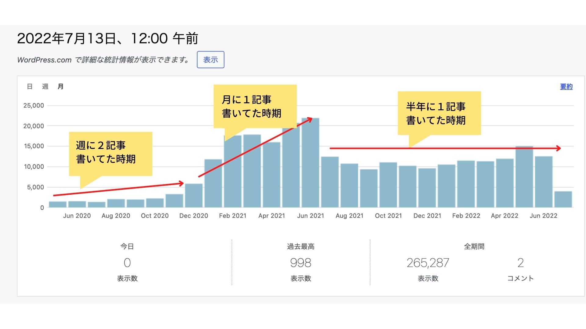 表示されているのは「月ごとのブログアクセス数(立ち上げから現在まで)」となっており、これが棒グラフで表現されています。